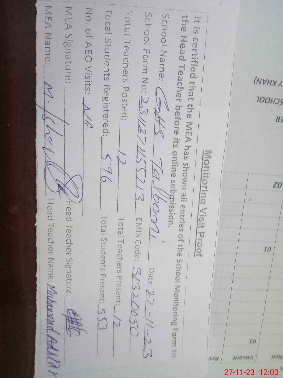 | Attendance Register | Head Teacher | MEA with School | Visit Proof |