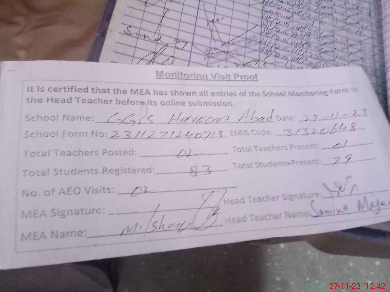 | Attendance Register | Head Teacher | MEA with School | Visit Proof |
