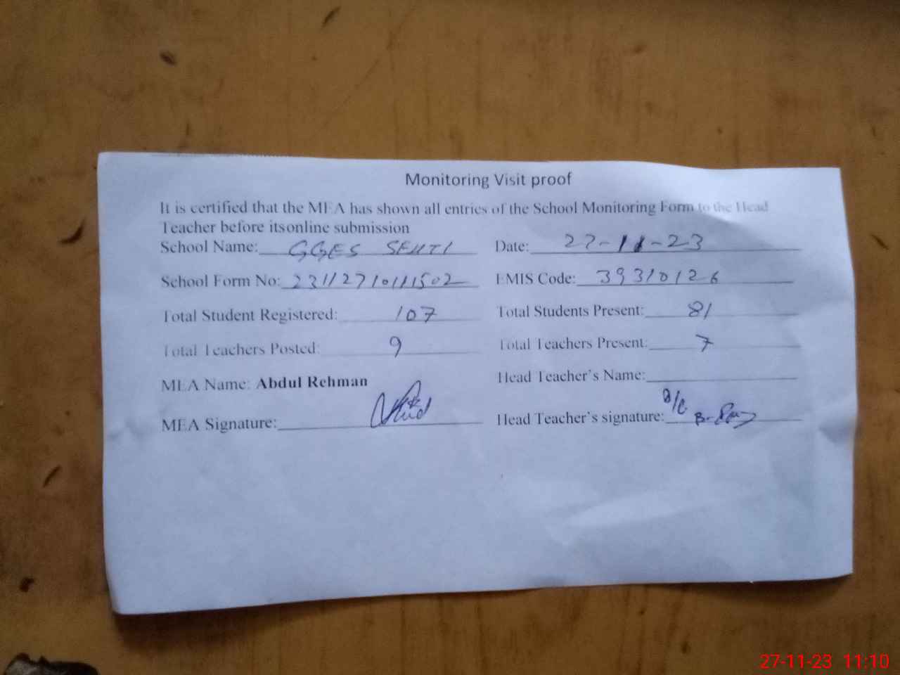 | Attendance Register | Head Teacher | MEA with School | Visit Proof |