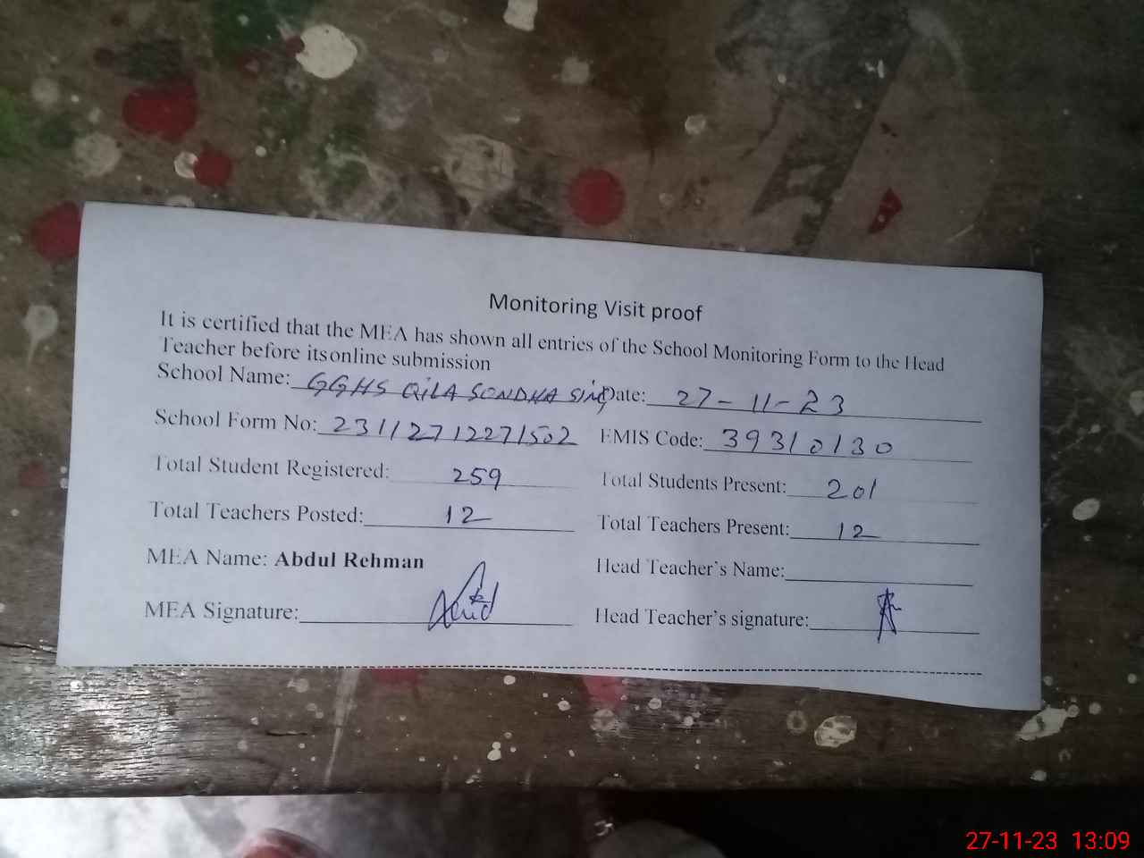 | Attendance Register | Head Teacher | MEA with School | Visit Proof |