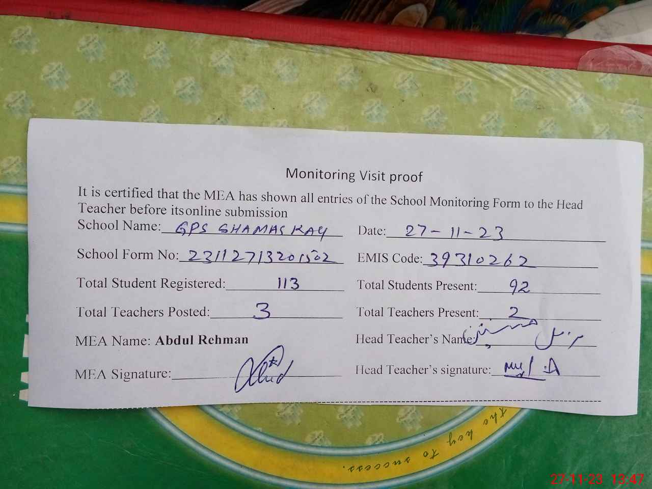 | EMIS Code: 39310262 | Name of School: GPS SHAMAS KAY | |||
