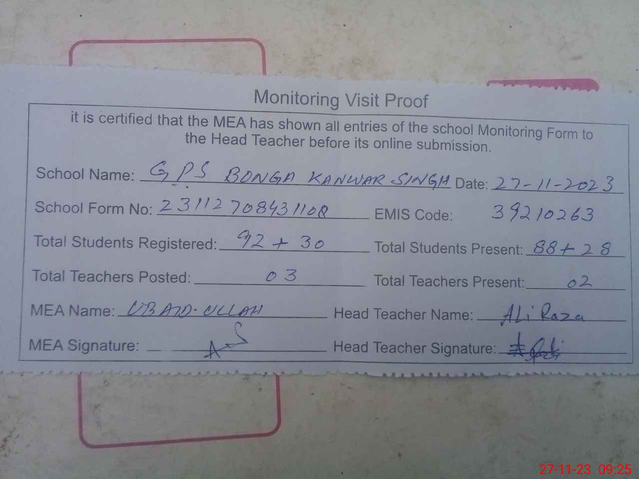 | EMIS Code: 39210263 | Name of School: GPS BUNGA KANWAR SINGH | |||