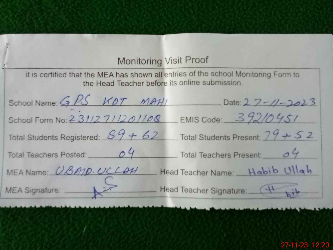 | Attendance Register | Head Teacher | MEA with School | Visit Proof |