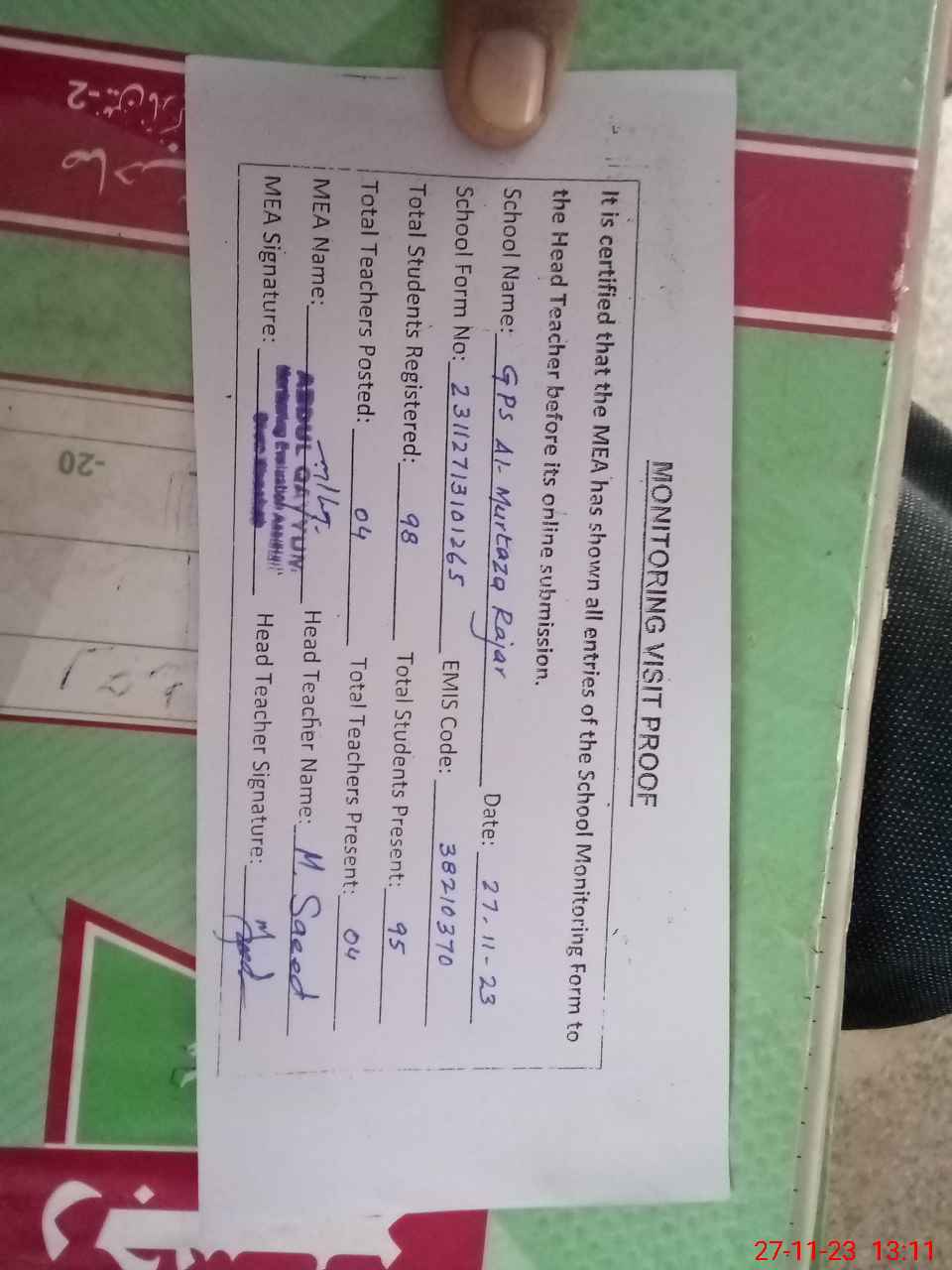 | EMIS Code: 38210370 | Name of School: GPS AL MURTAZA RAJAR | |||