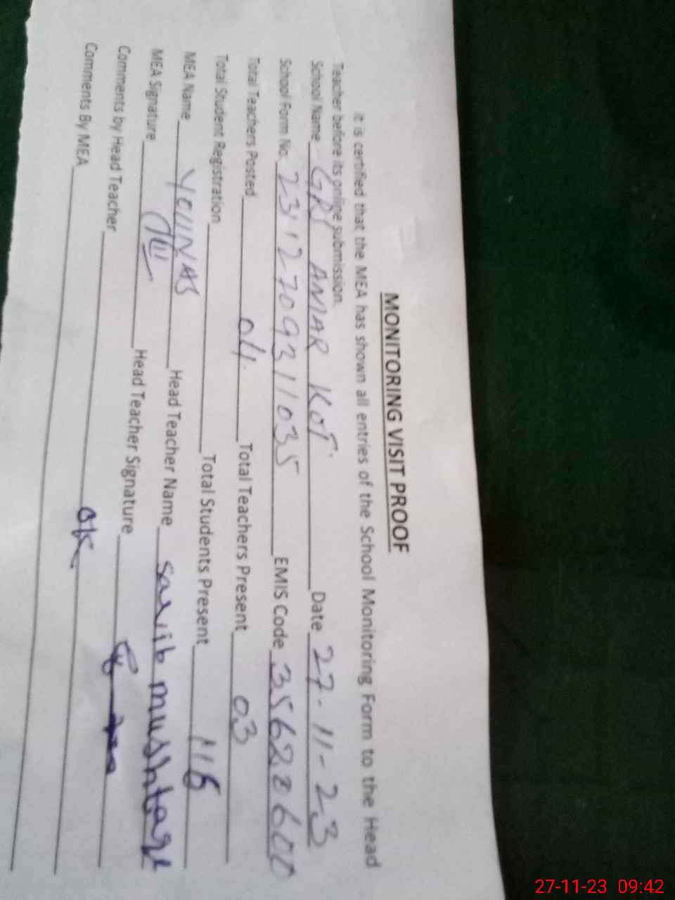 | Attendance Register | Head Teacher | MEA with School | Visit Proof |