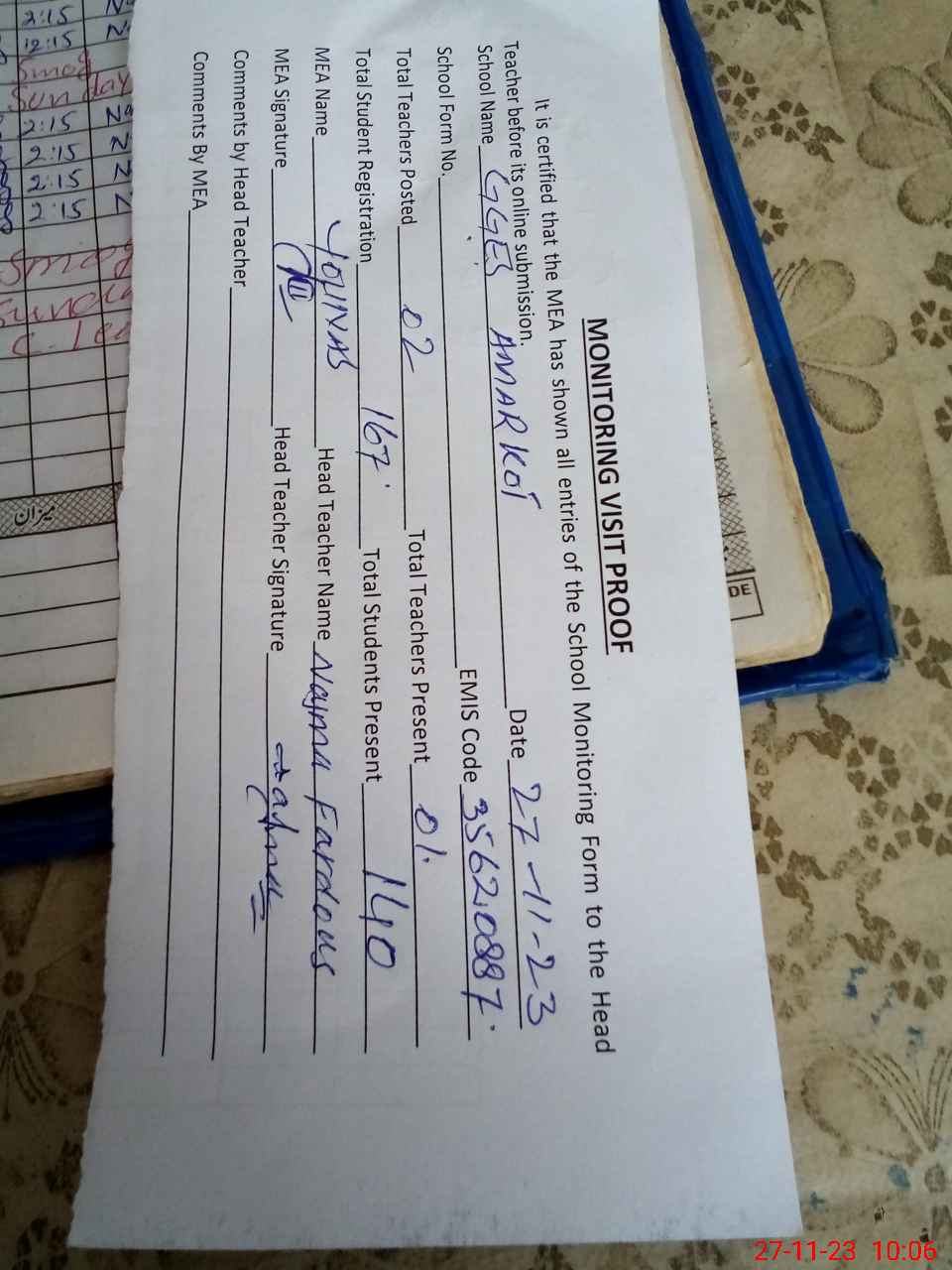 | Attendance Register | Head Teacher | MEA with School | Visit Proof |