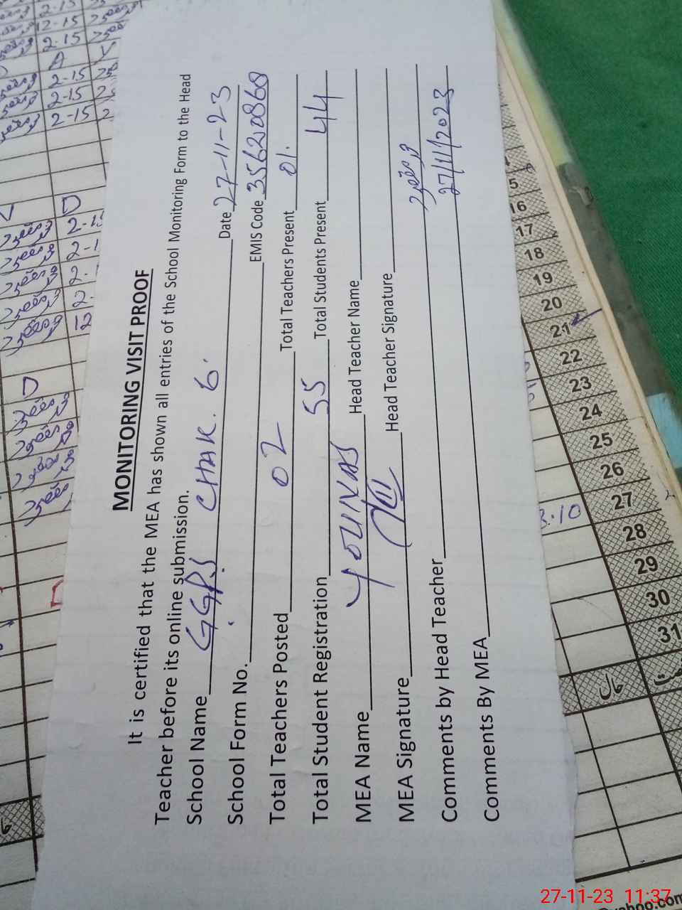 | Attendance Register | Head Teacher | MEA with School | Visit Proof |