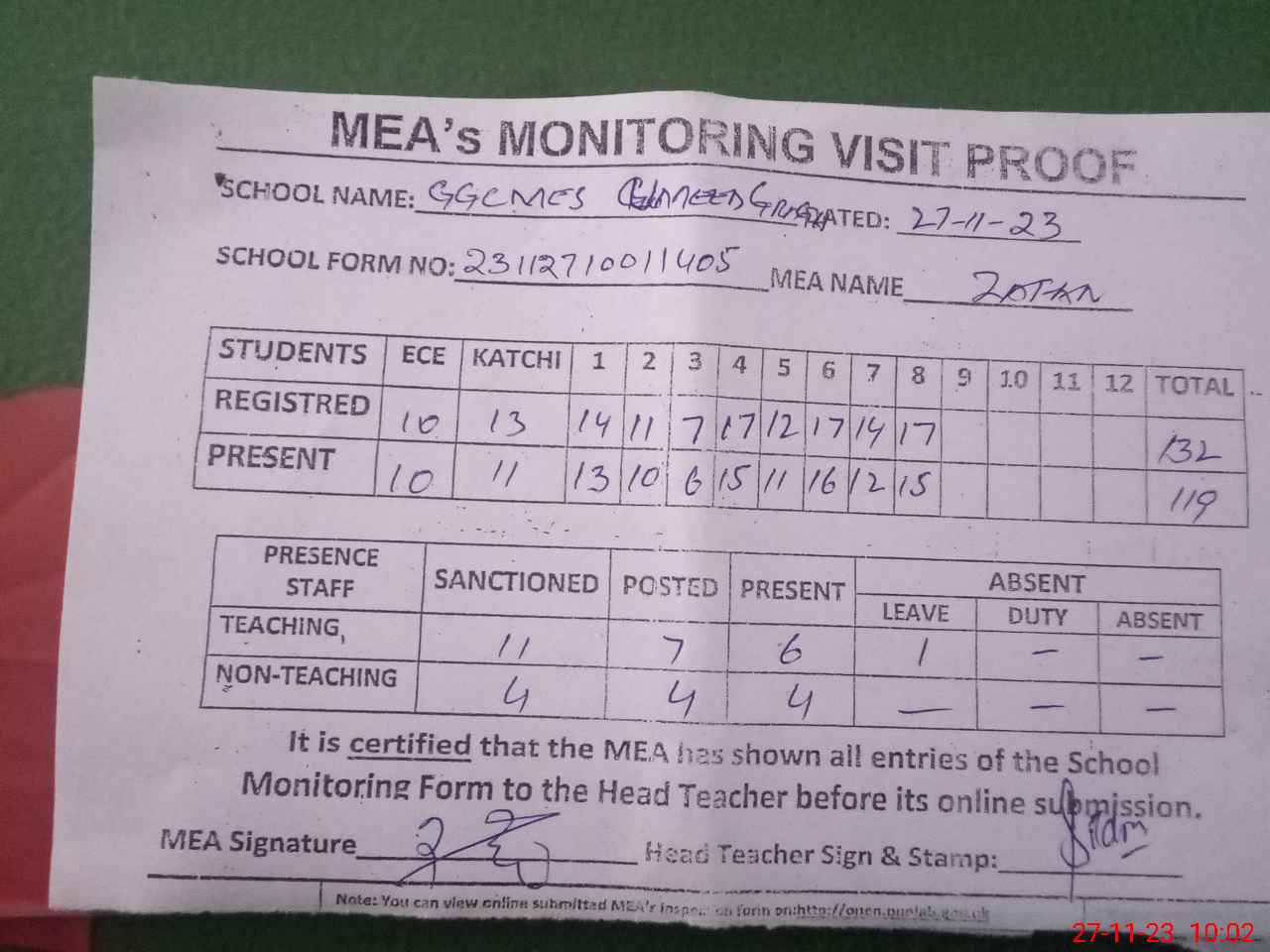 | Attendance Register | Head Teacher | MEA with School | Visit Proof |