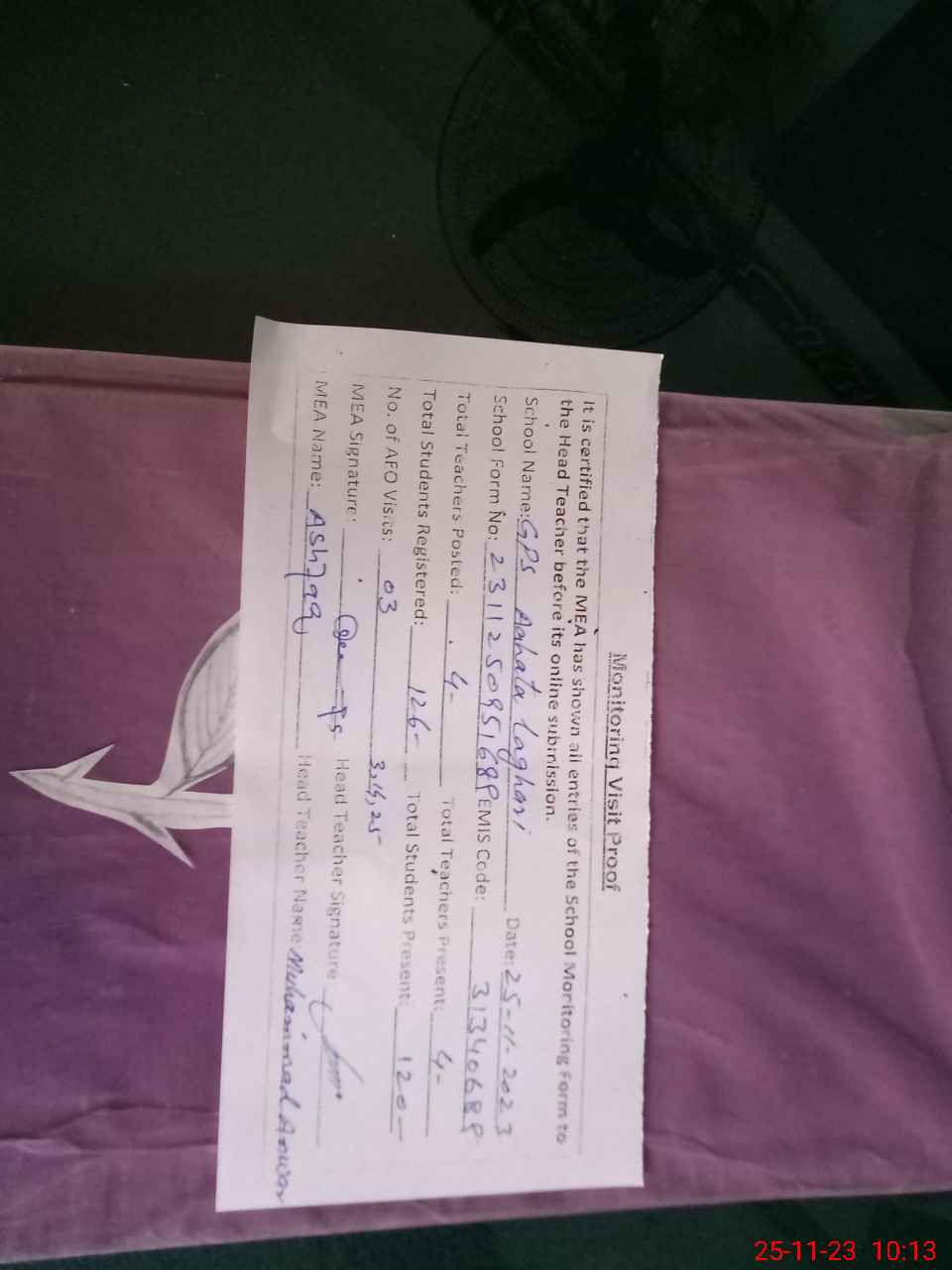 | Attendance Register | Head Teacher | MEA with School | Visit Proof |