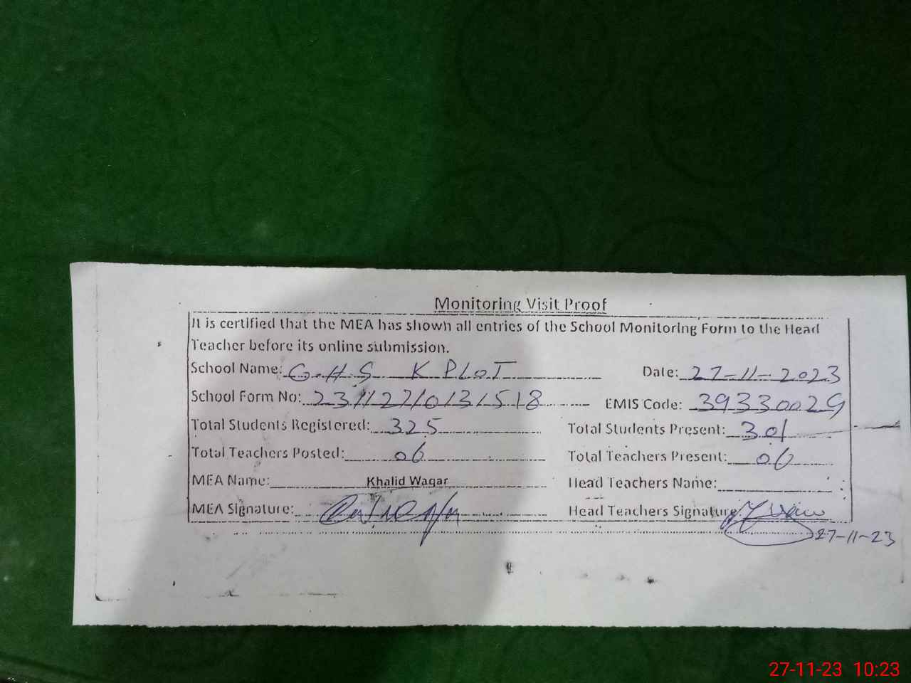 | EMIS Code: 39330029 | Name of School: GHS K PLOT | |||