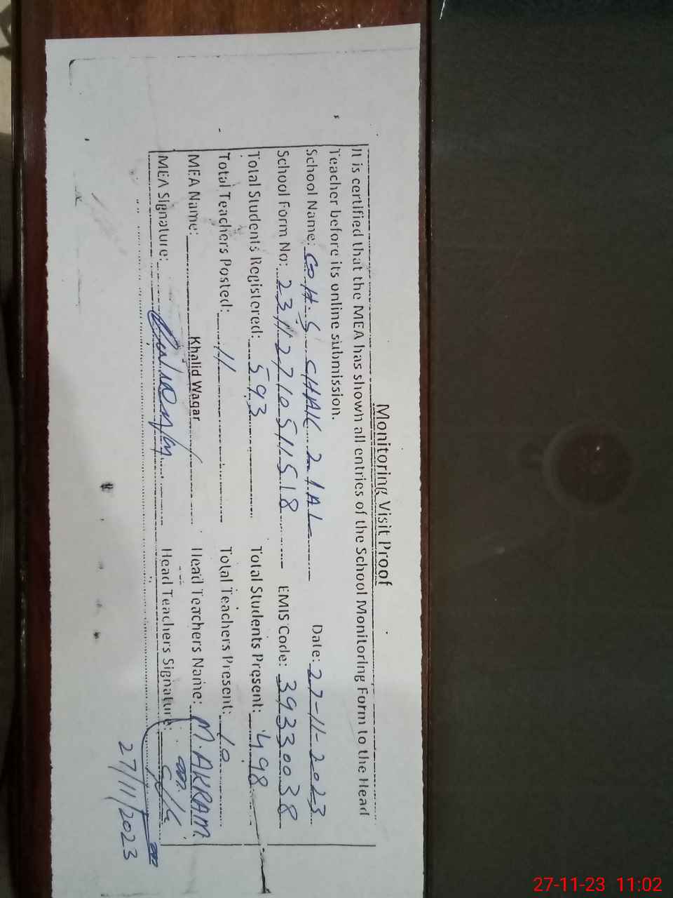 | EMIS Code: 39330038 | Name of School: GHS CHAK NO. 2/1-AL | |||