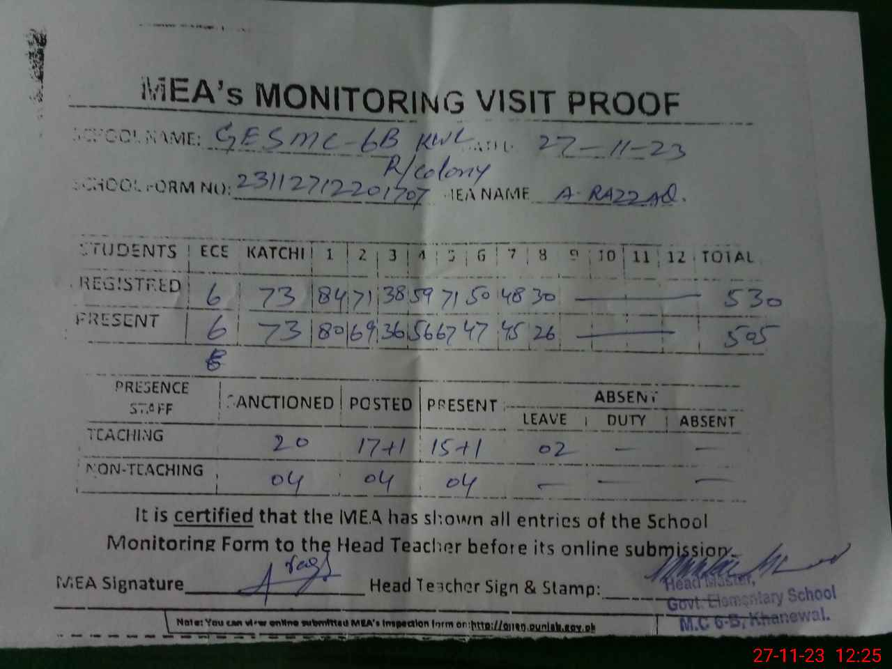| Attendance Register | Head Teacher | MEA with School | Visit Proof |
