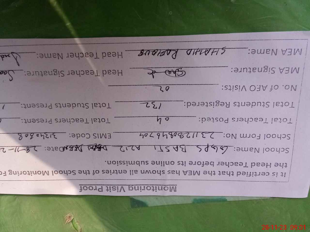 | Attendance Register | Head Teacher | MEA with School | Visit Proof |