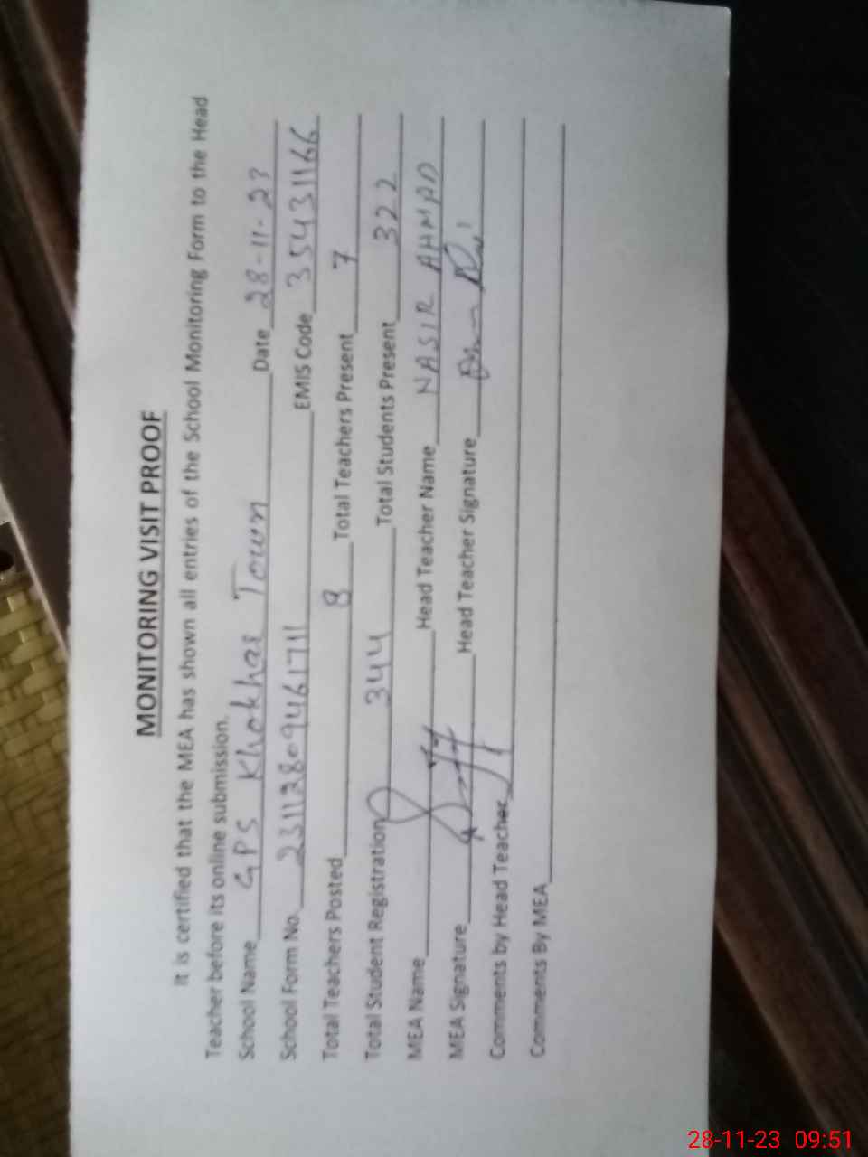 | Attendance Register | Head Teacher | MEA with School | Visit Proof |