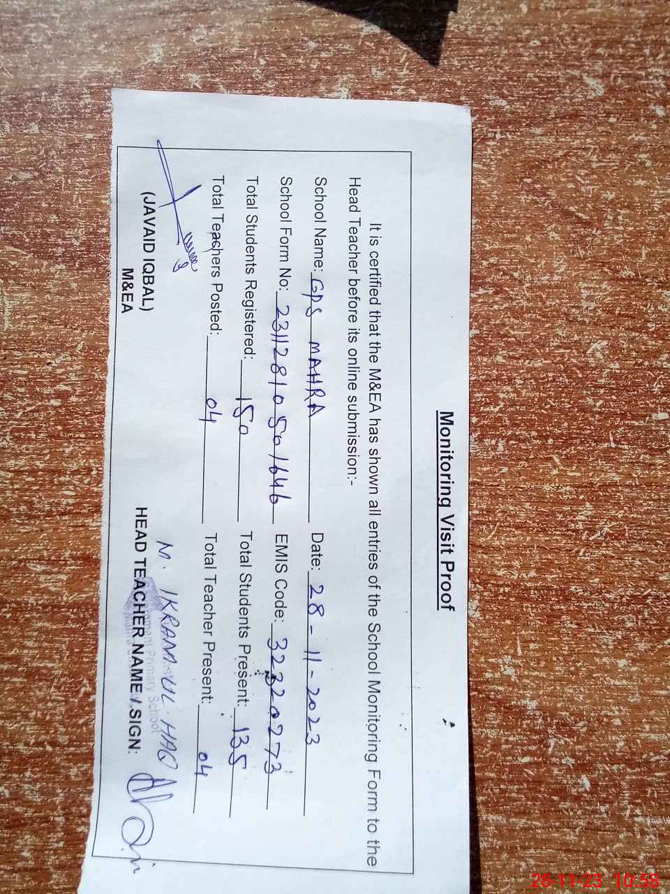 | Attendance Register | Head Teacher | MEA with School | Visit Proof |