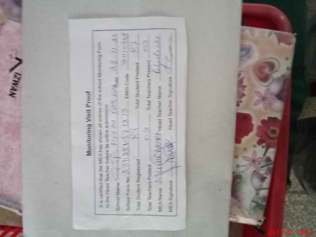 | Attendance Register | Head Teacher | MEA with School | Visit Proof |