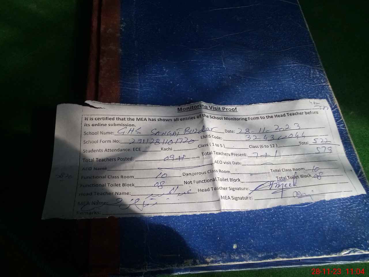 | EMIS Code: 32430044 | Name of School: GHS SANGAT BUZDAR | |||