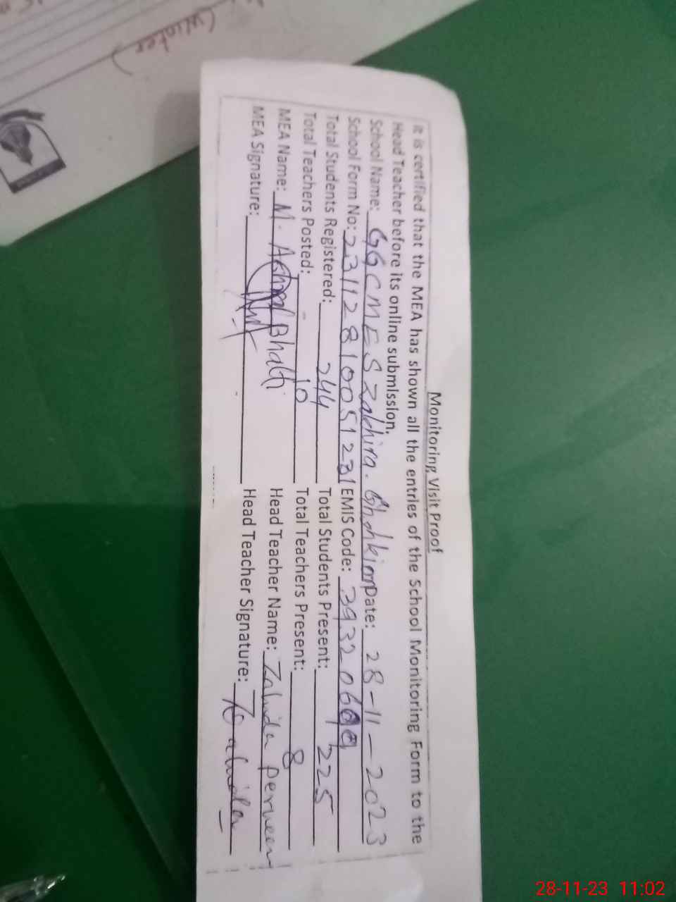 | Attendance Register | Head Teacher | MEA with School | Visit Proof |