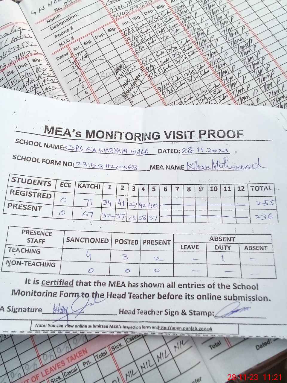 | Attendance Register | Head Teacher | MEA with School | Visit Proof |