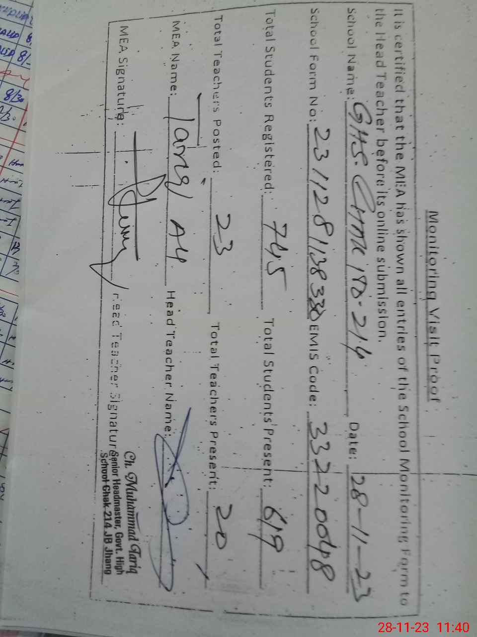 | Attendance Register | Head Teacher | MEA with School | Visit Proof |