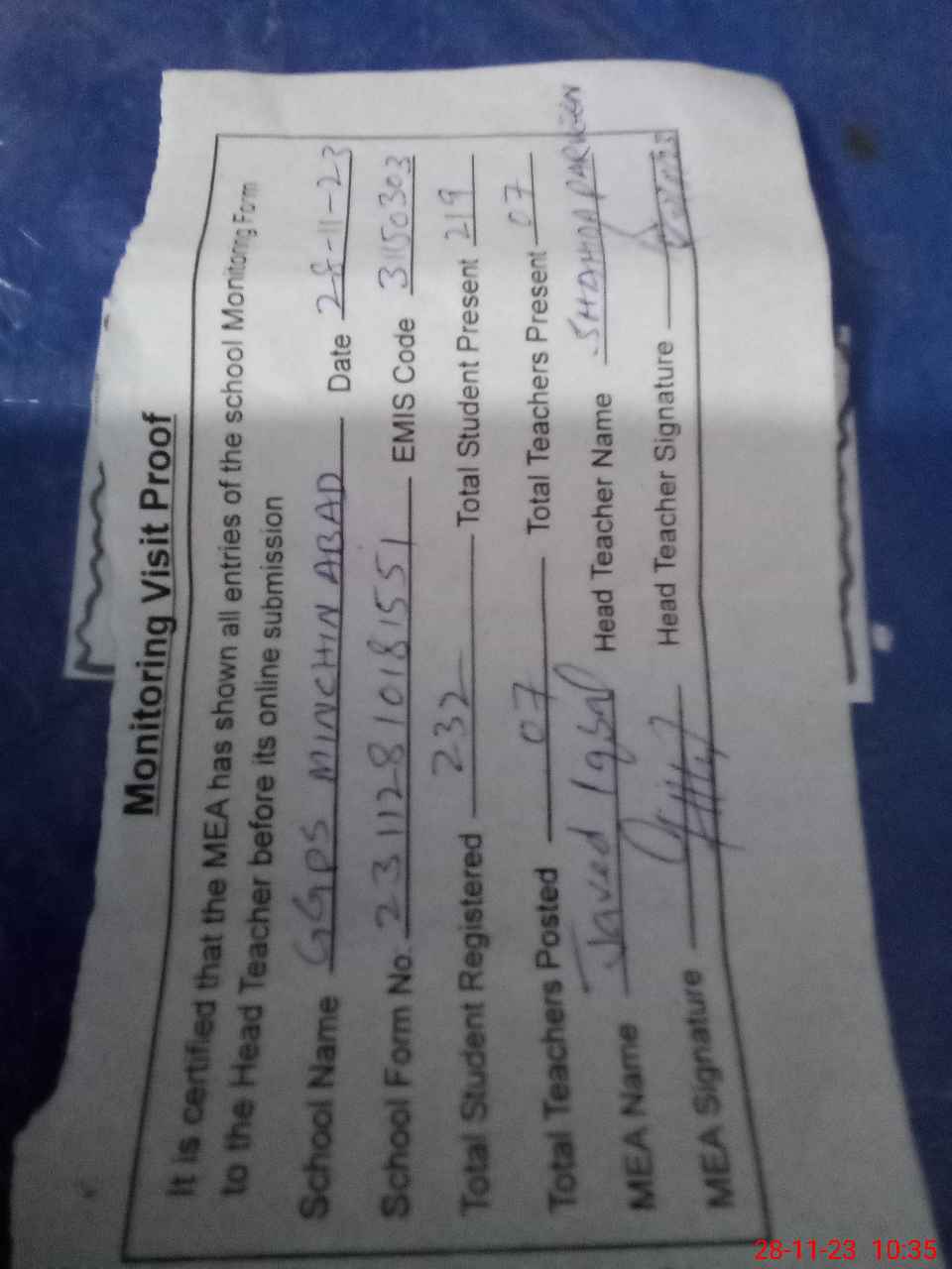 | Attendance Register | Head Teacher | MEA with School | Visit Proof |