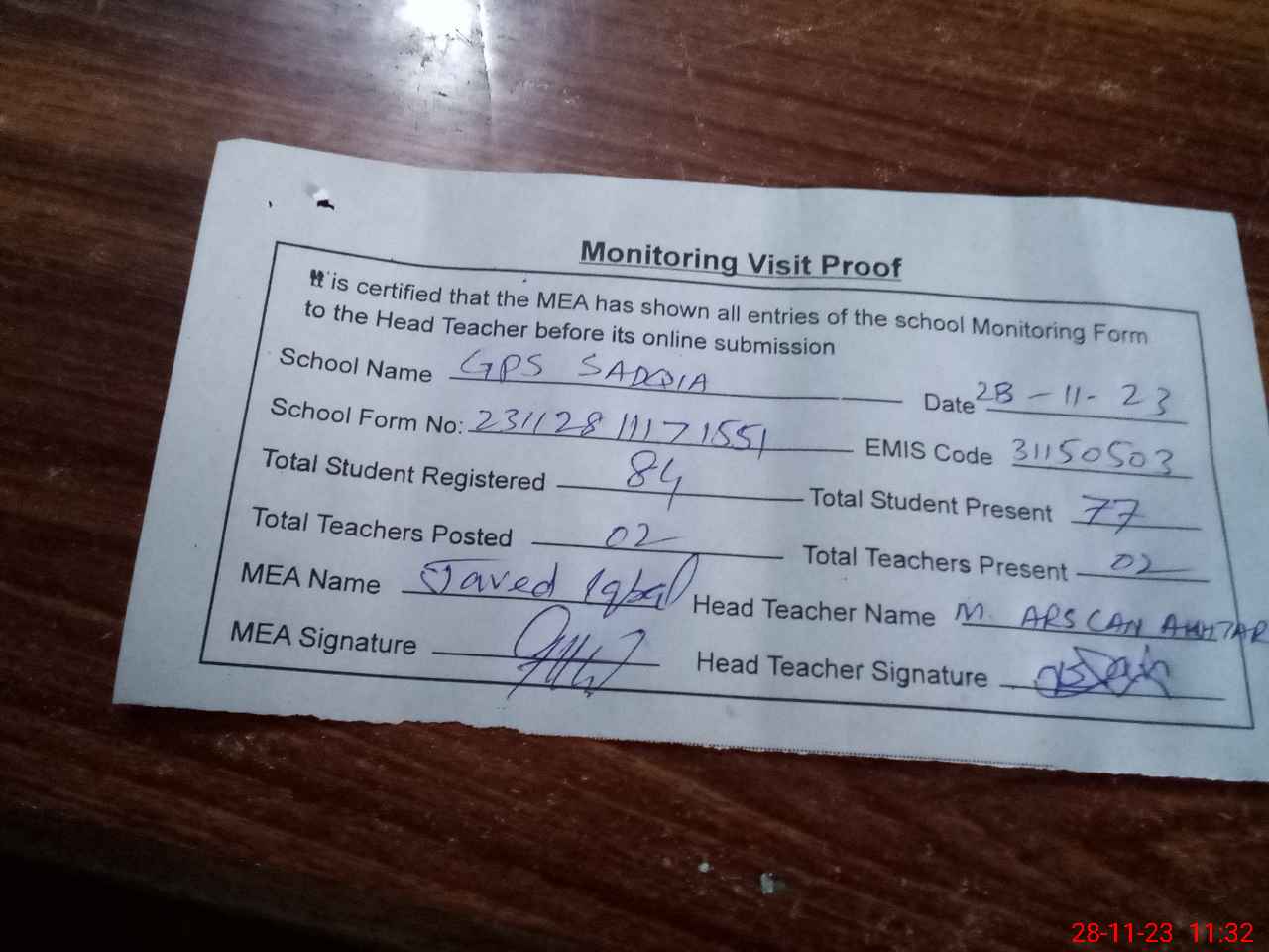 | Attendance Register | Head Teacher | MEA with School | Visit Proof |