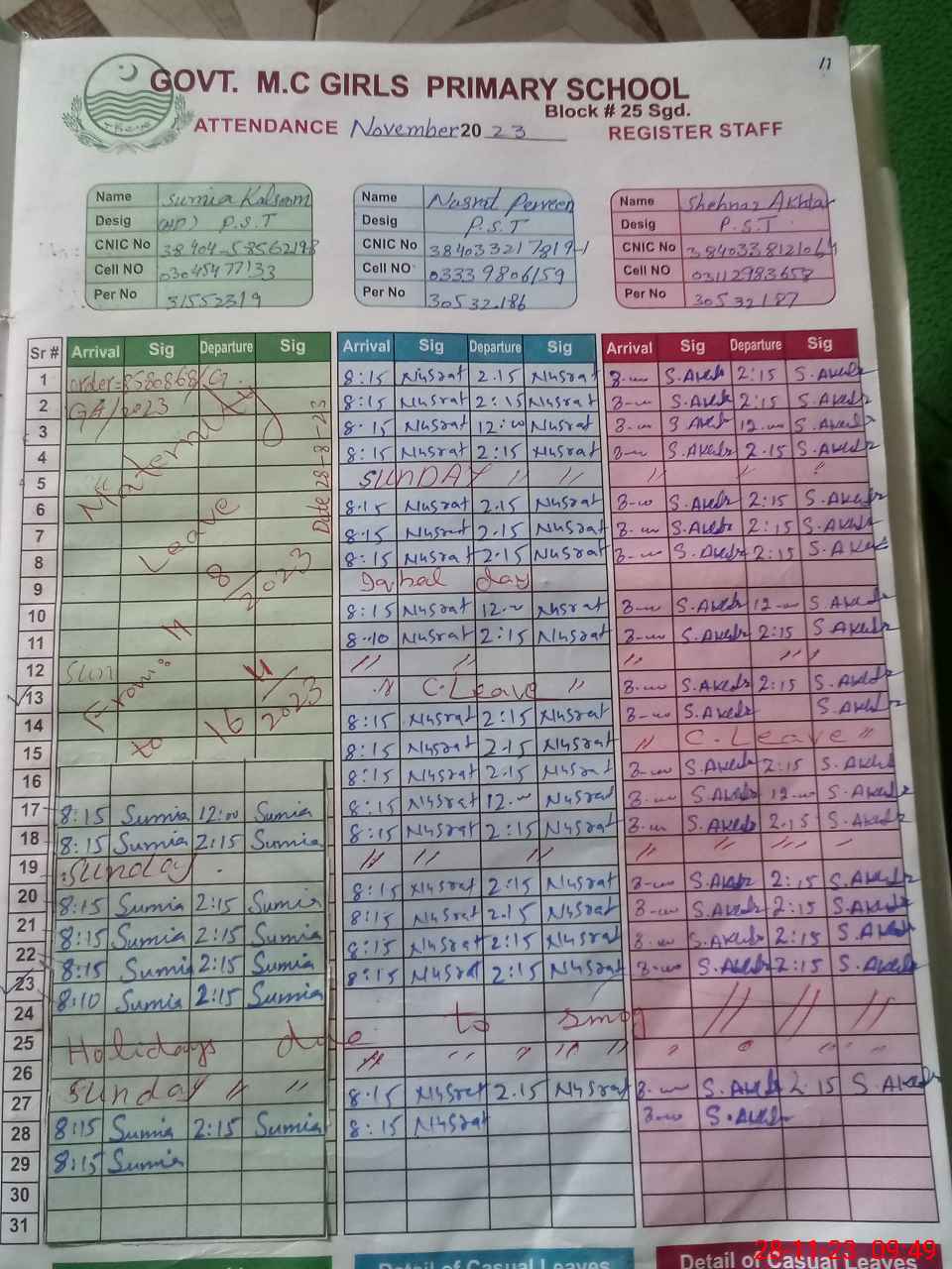 | CNIC | Full Name | Designation | R/C | Absence During Last Calender Month |
