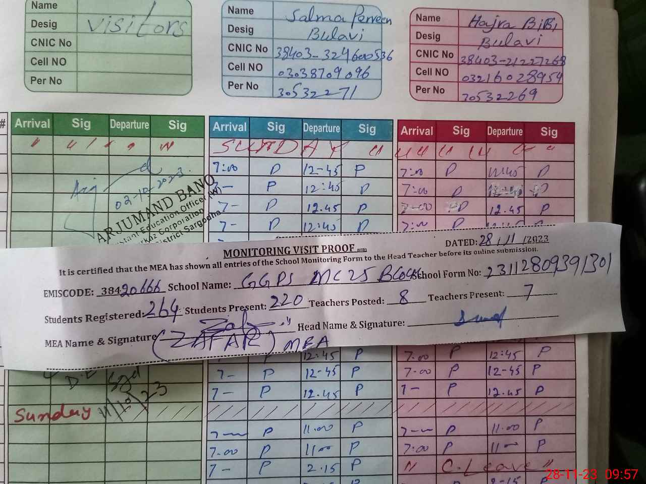 | Attendance Register | Head Teacher | MEA with School | Visit Proof |