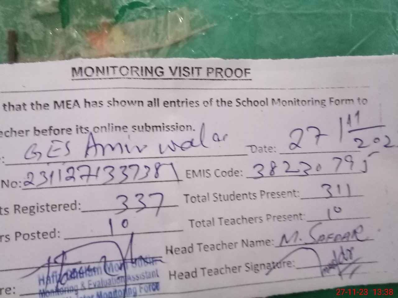 | Attendance Register | Head Teacher | MEA with School | Visit Proof |