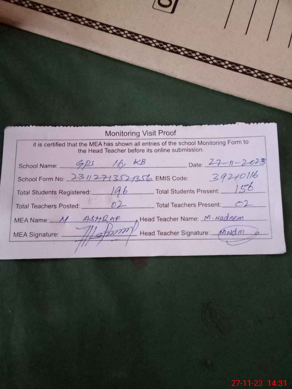 | EMIS Code: 39210116 | Name of School: GPS 16 KB | |||