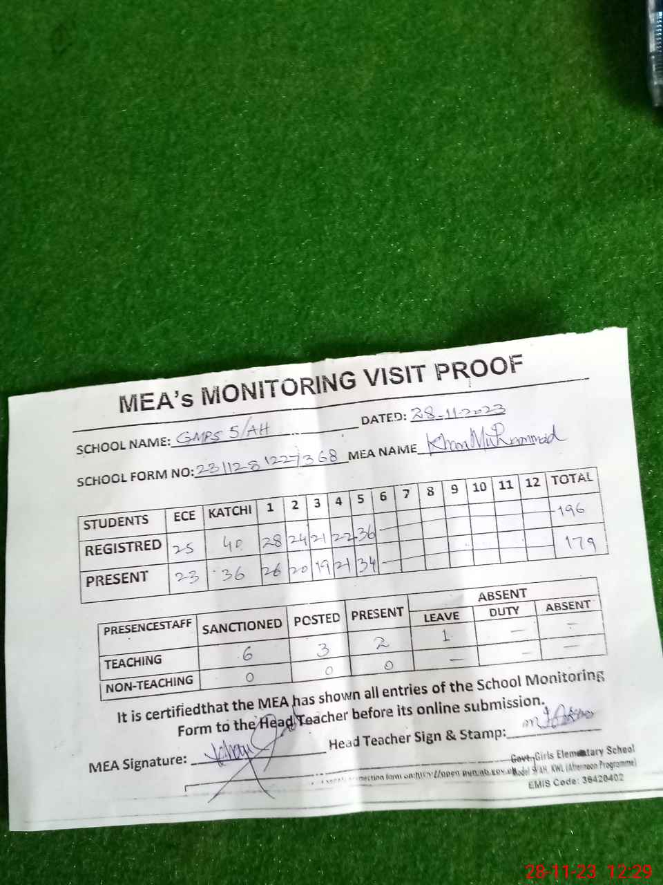 | Attendance Register | Head Teacher | MEA with School | Visit Proof |