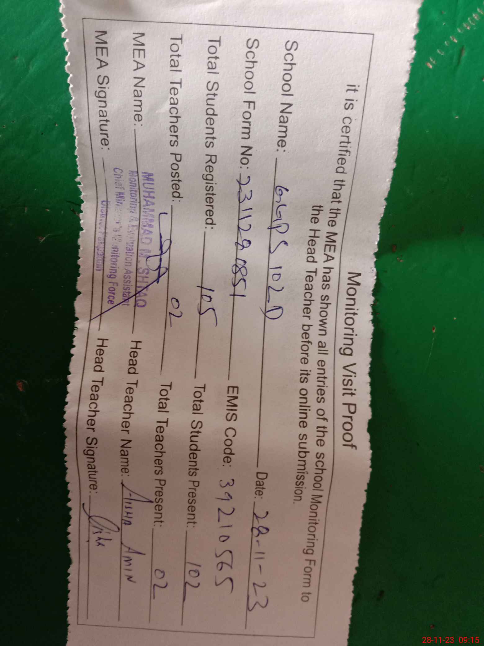 | Attendance Register | Head Teacher | MEA with School | Visit Proof |