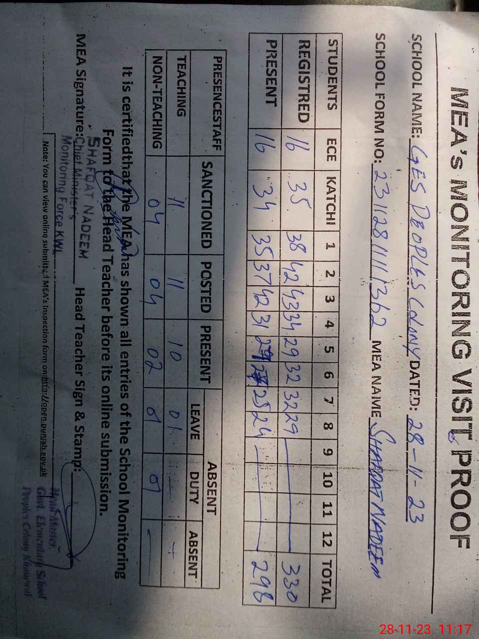| Attendance Register | Head Teacher | MEA with School | Visit Proof |