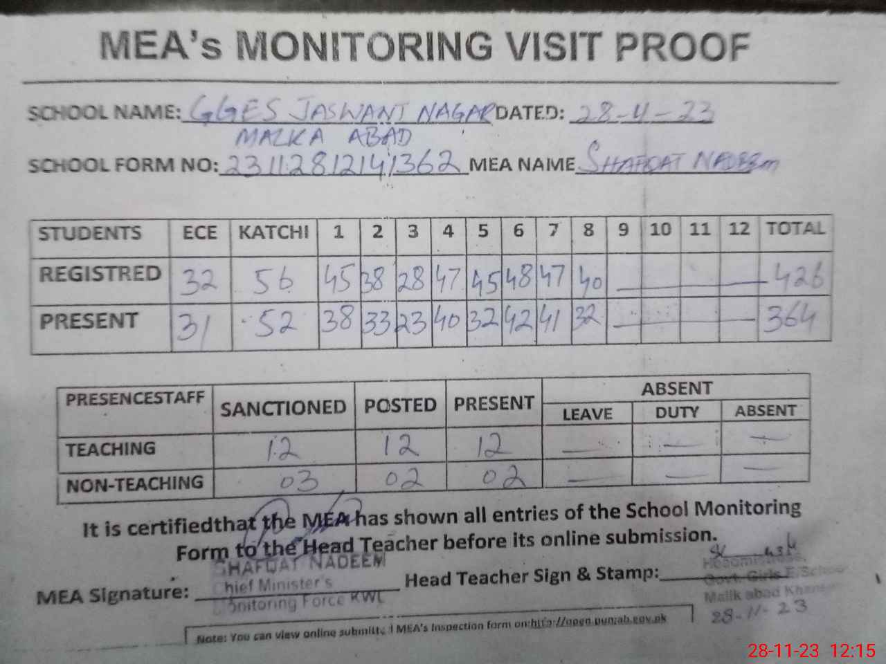 | Attendance Register | Head Teacher | MEA with School | Visit Proof |