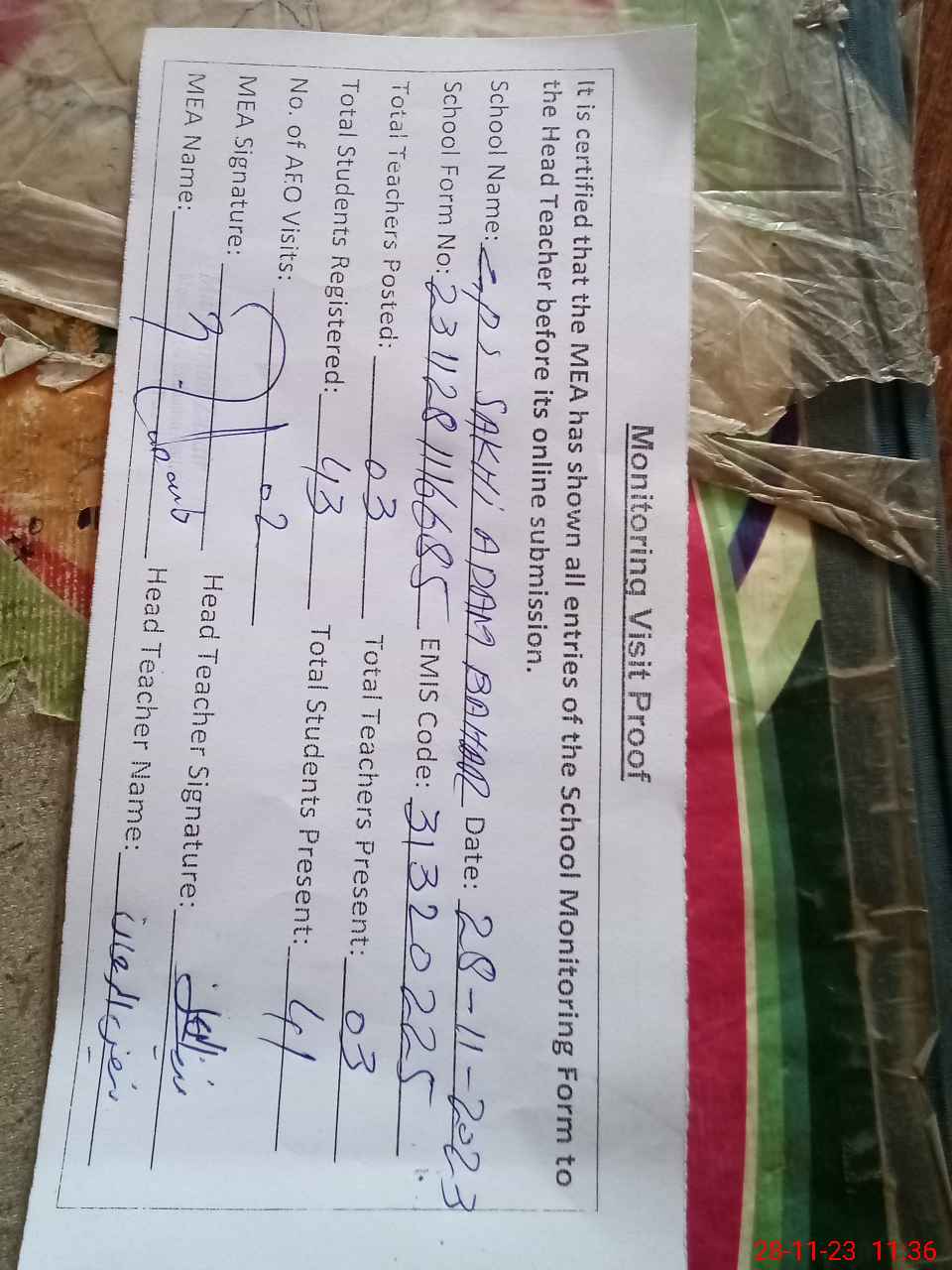 | EMIS Code: 31320225 | Name of School: GPS SAKHI ADAM BAHAR | |||