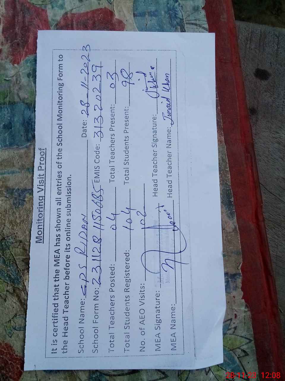 | Attendance Register | Head Teacher | MEA with School | Visit Proof |