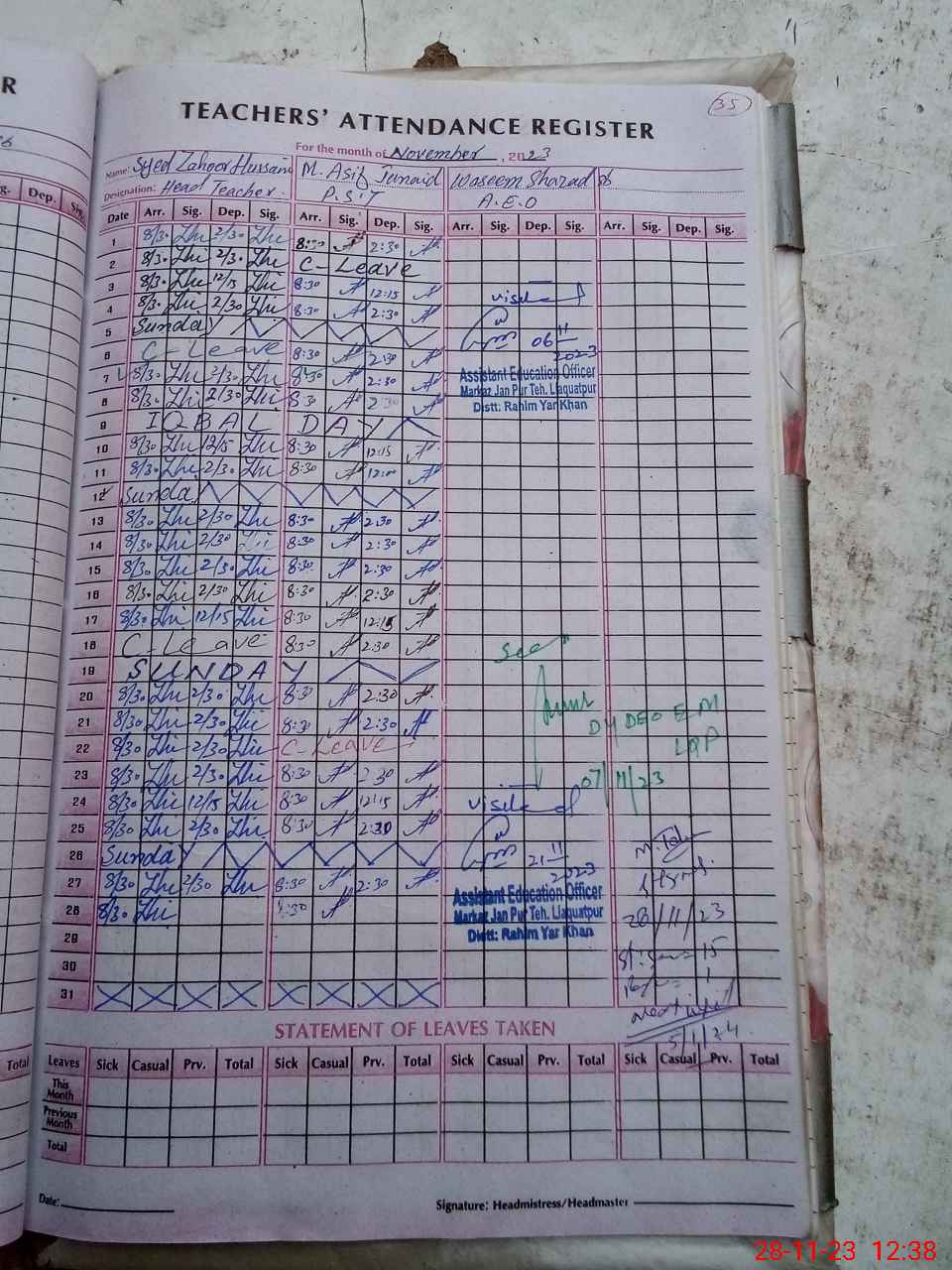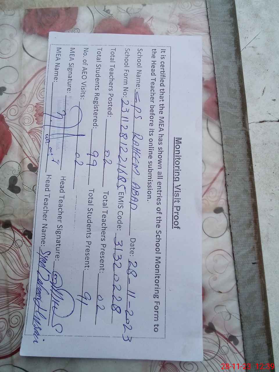 | Attendance Register | Head Teacher | MEA with School | Visit Proof |
