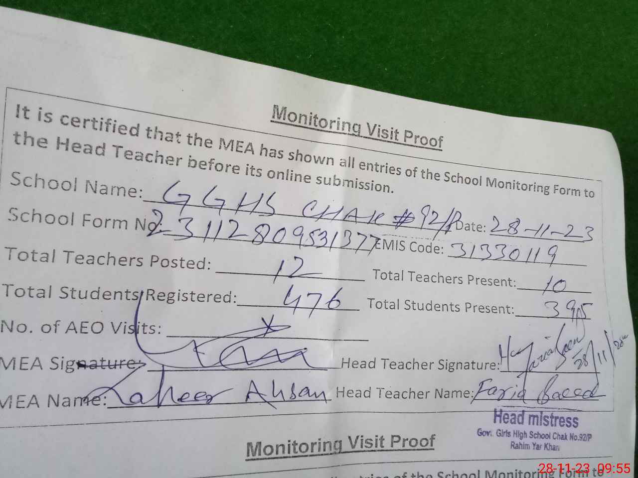 | Attendance Register | Head Teacher | MEA with School | Visit Proof |