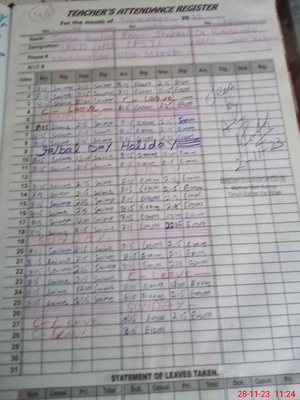 | CNIC | Full Name | Designation | R/C | Absence During Last Calender Month |