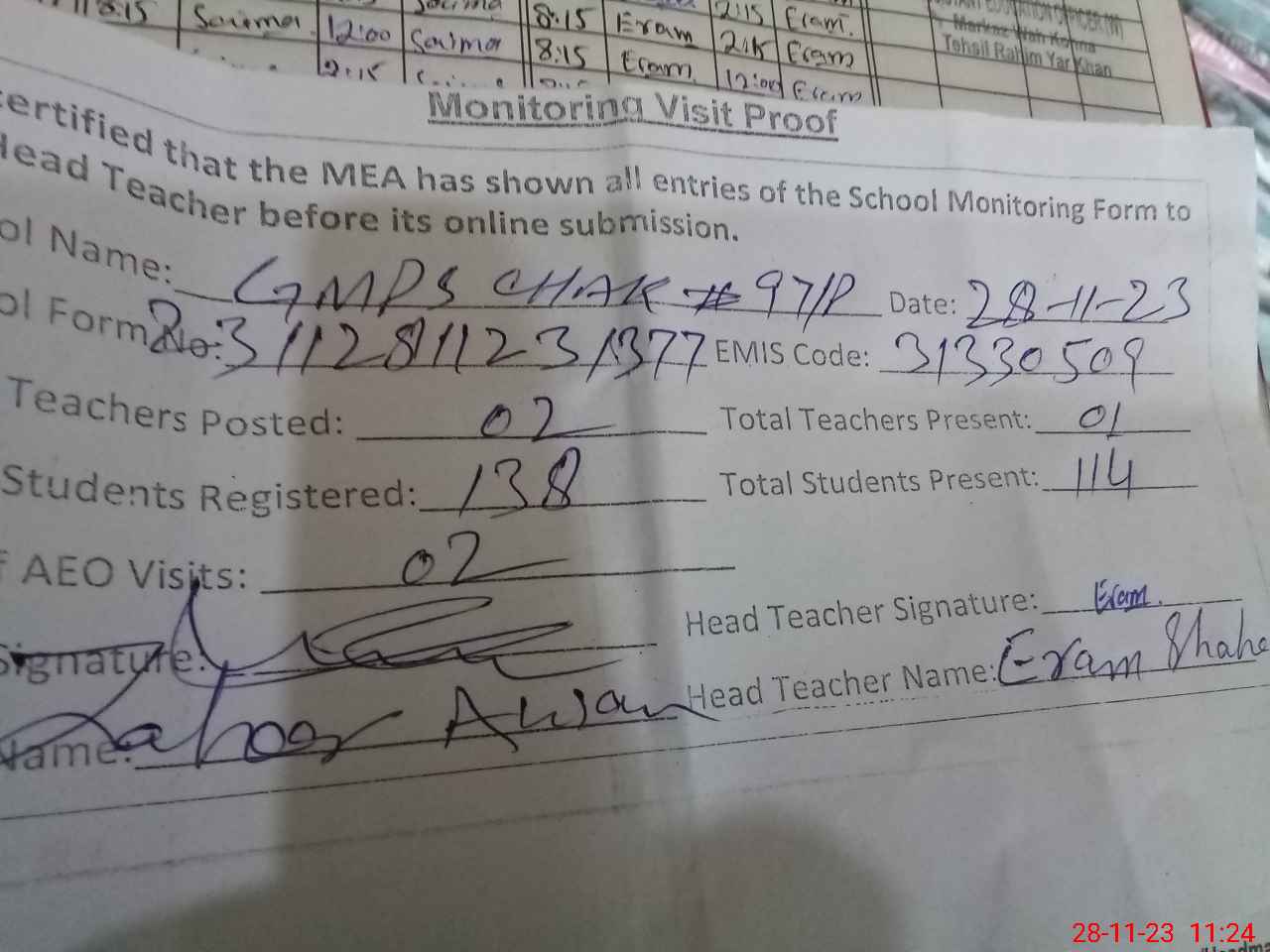 | Attendance Register | Head Teacher | MEA with School | Visit Proof |