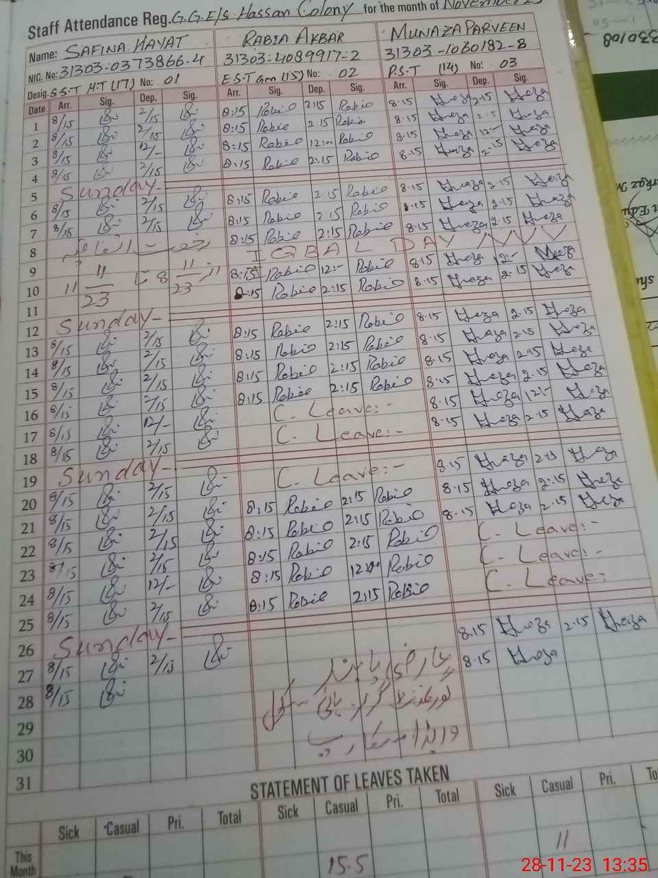 | CNIC | Full Name | Designation | R/C | Absence During Last Calender Month |