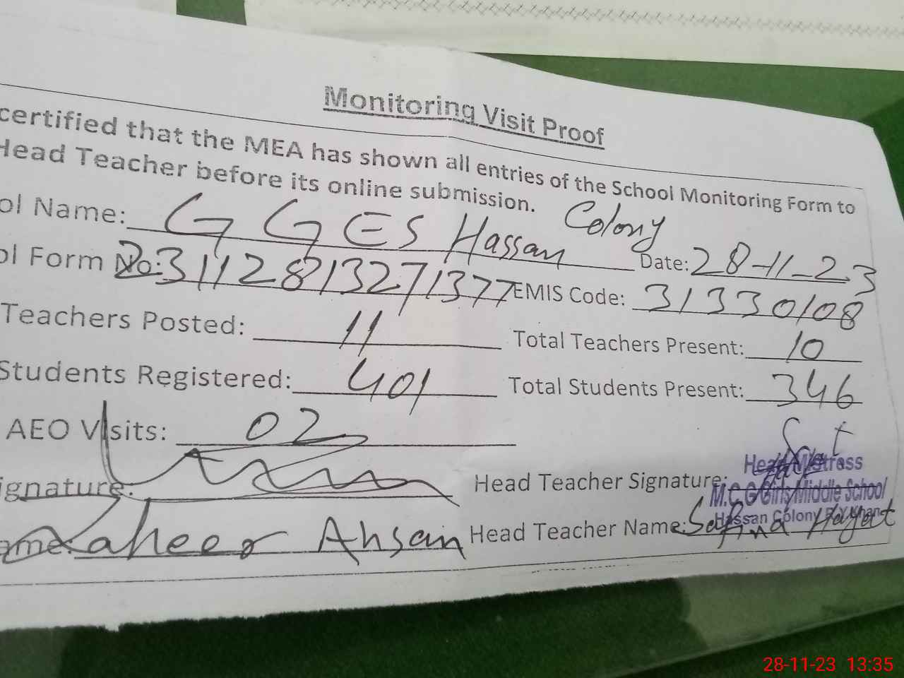 | Attendance Register | Head Teacher | MEA with School | Visit Proof |