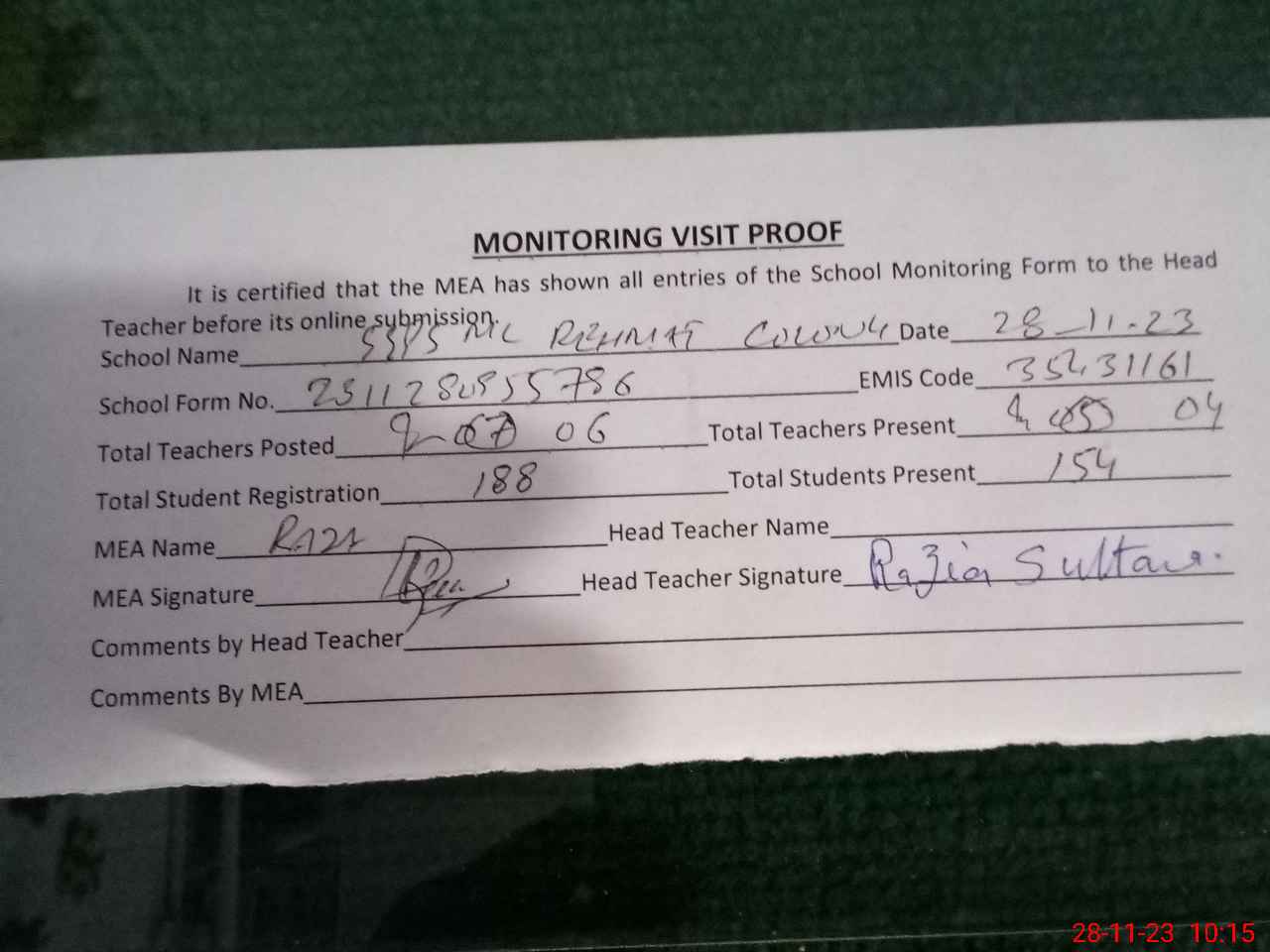 | Attendance Register | Head Teacher | MEA with School | Visit Proof |