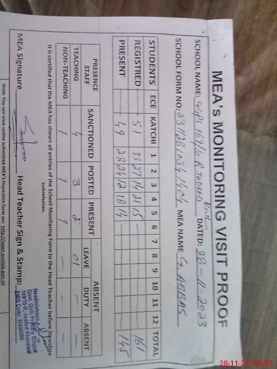 | EMIS Code: 36420380 | Name of School: GGPS 169/10-R, 169/10-R JADEED, KHANEWAL | |||