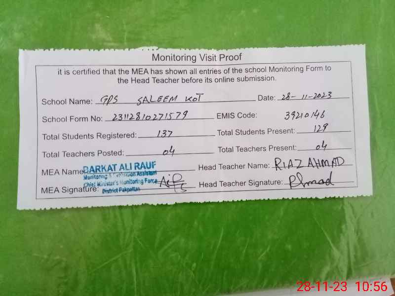 | EMIS Code: 39210146 | Name of School: GPS SALEEM KOT PAKPATTAN | |||