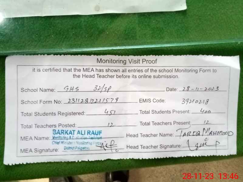 | EMIS Code: 39210218 | Name of School: GHS CHAK NO. 32 SP | |||