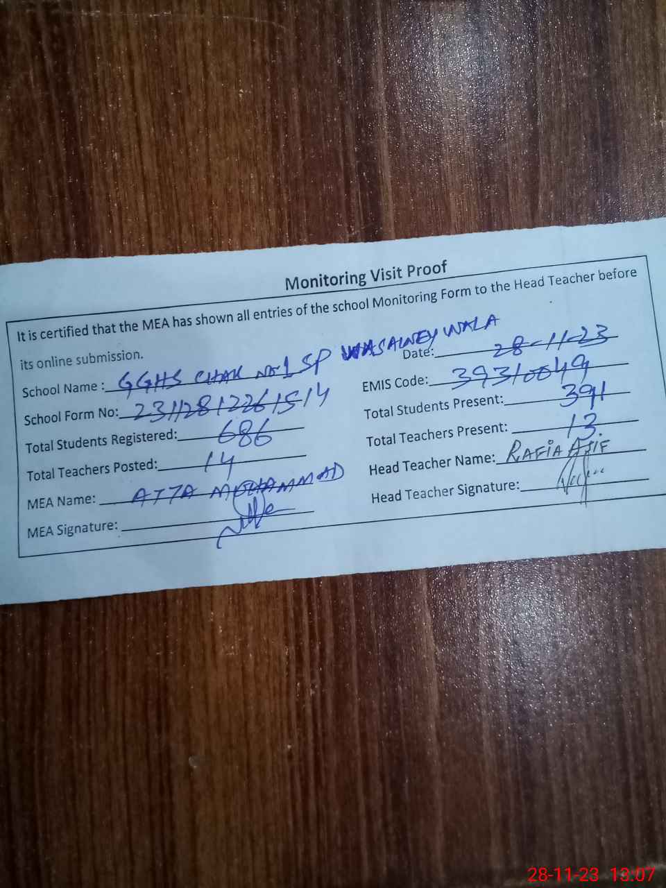 | EMIS Code: 39310049 | Name of School: GGHS CHAK NO. 1/SP WASAWAY WALA | |||