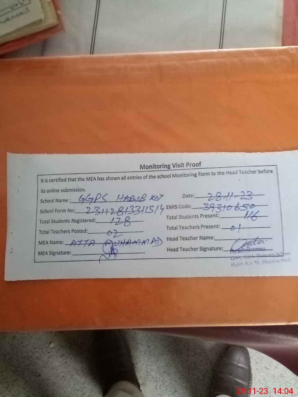 | Attendance Register | Head Teacher | MEA with School | Visit Proof |