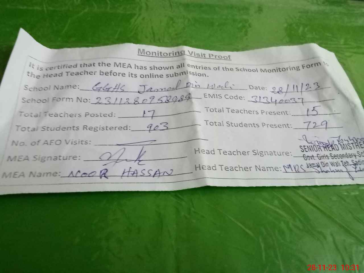 | Attendance Register | Head Teacher | MEA with School | Visit Proof |