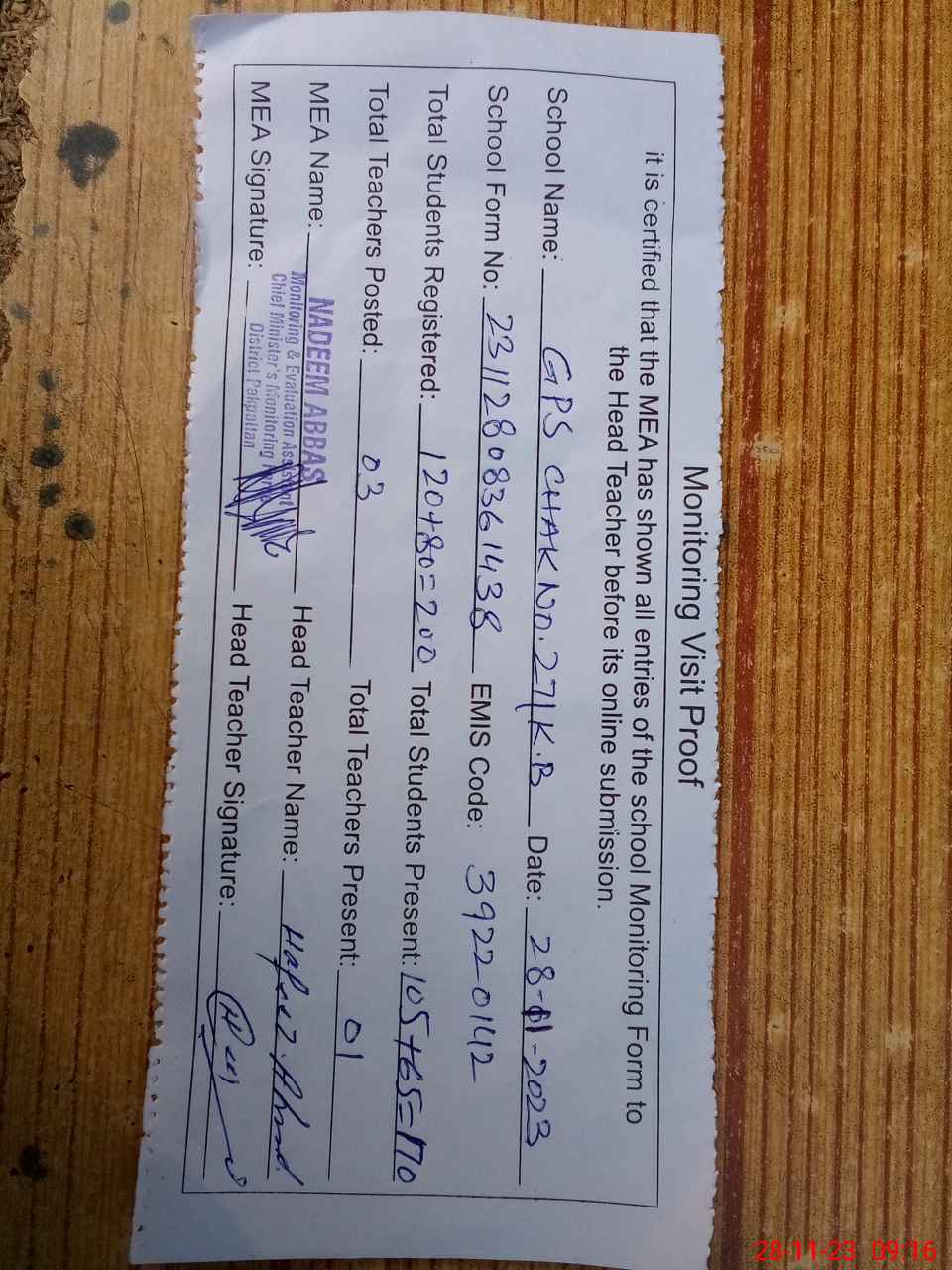 | Attendance Register | Head Teacher | MEA with School | Visit Proof |